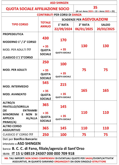 Gl'importi dei Contributi saranno comprensivi di Quota Affiliazione + Quota Tesseramento + Quota Corso + Quota Saggio